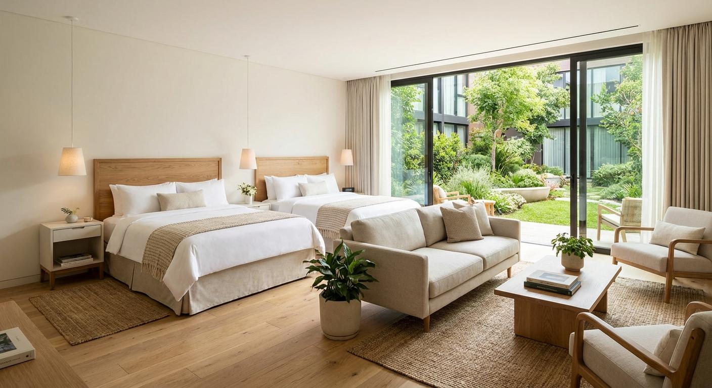 Escape to tranquility in our Family Garden Suite, a masterfully designed sanctuary that blends modern luxury with the serene beauty of nature. Perfectly suited for families or small groups, this spacious suite features two plush queen-sized beds adorned with premium linens, ensuring a restful night's sleep for everyone. Large, floor-to-ceiling windows bathe the room in warm, natural light and offer enchanting views of our meticulously landscaped private gardens. Step out onto your private terrace to enjoy your morning coffee amidst the scent of blooming flowers and the gentle rustle of leaves. The suite also boasts a comfortable seating area, a dedicated workspace for those who need to stay connected, and a luxurious bathroom equipped with high-end amenities. Whether you're unwinding after a day of exploration or planning your next adventure, the Family Garden Suite provides the perfect backdrop for unforgettable family memories.